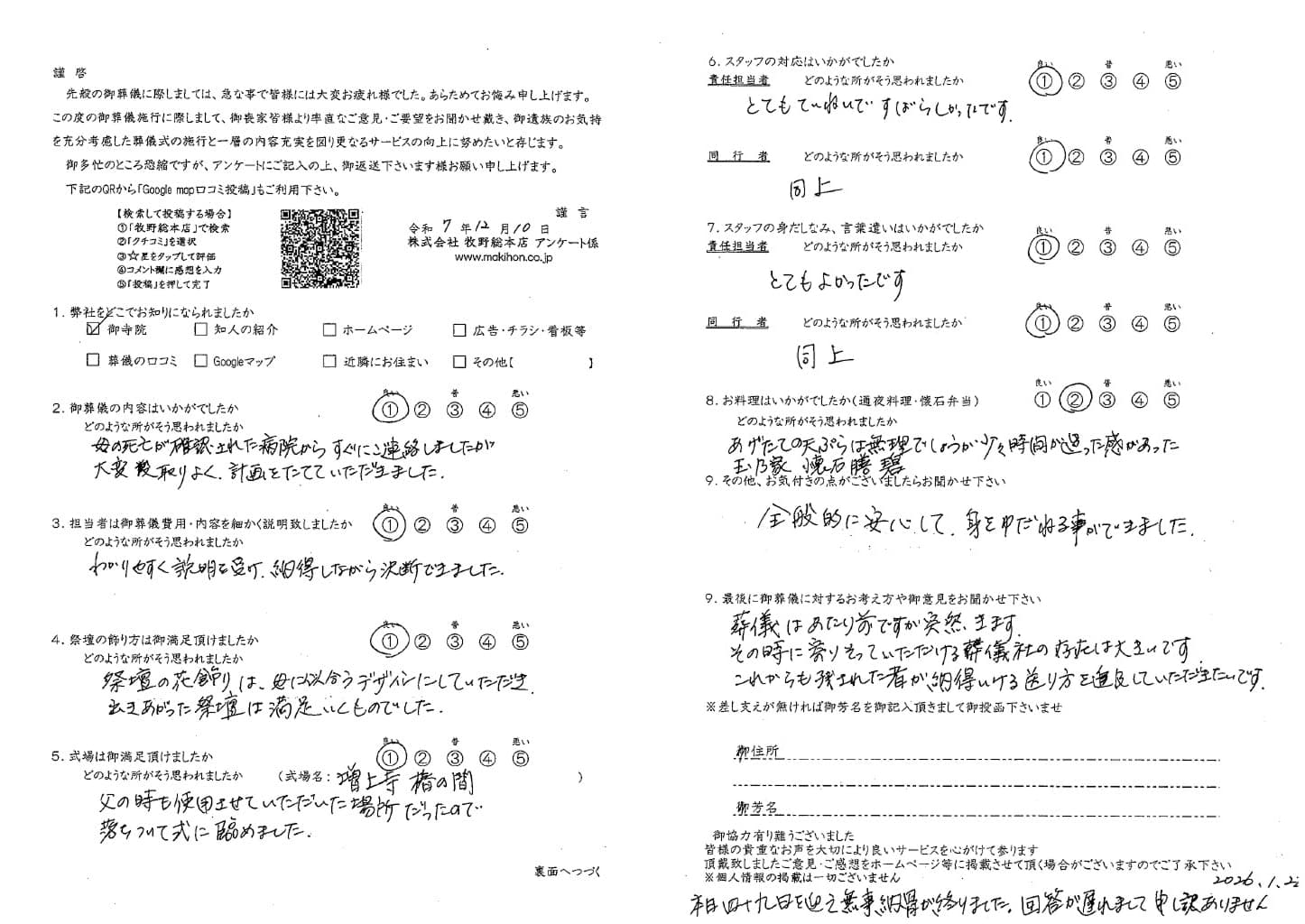 祭壇や式次第にしっかりと想いを込めつつ、港区の斎場・安置所を利用し、落ち着いた環境でお別れの時間をお過ごしいただきました。私たちスタッフは、ご予算やご希望を丁寧に伺いながら、一つひとつ確認を重ね、安心してお任せいただける葬儀を心がけました。