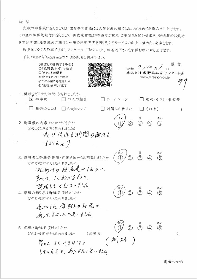 温かいお言葉をいただきありがとうございます。ご家族の皆さまが穏やかにお見送りできたとのお声を励みに、今後も丁寧なご葬儀を心がけてまいります。