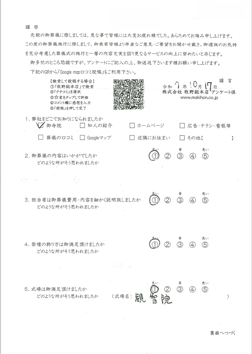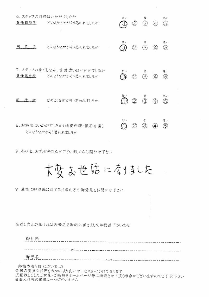 温かいご感想をお寄せいただき、誠にありがとうございます。祭壇・進行・スタッフ対応にご満足いただけたとのこと、担当一同大変励みになります。ご葬儀後の諸手続きや法要のご相談も承りますので、どうぞお気軽にお声がけください。故人様のご冥福を心よりお祈り申し上げます。